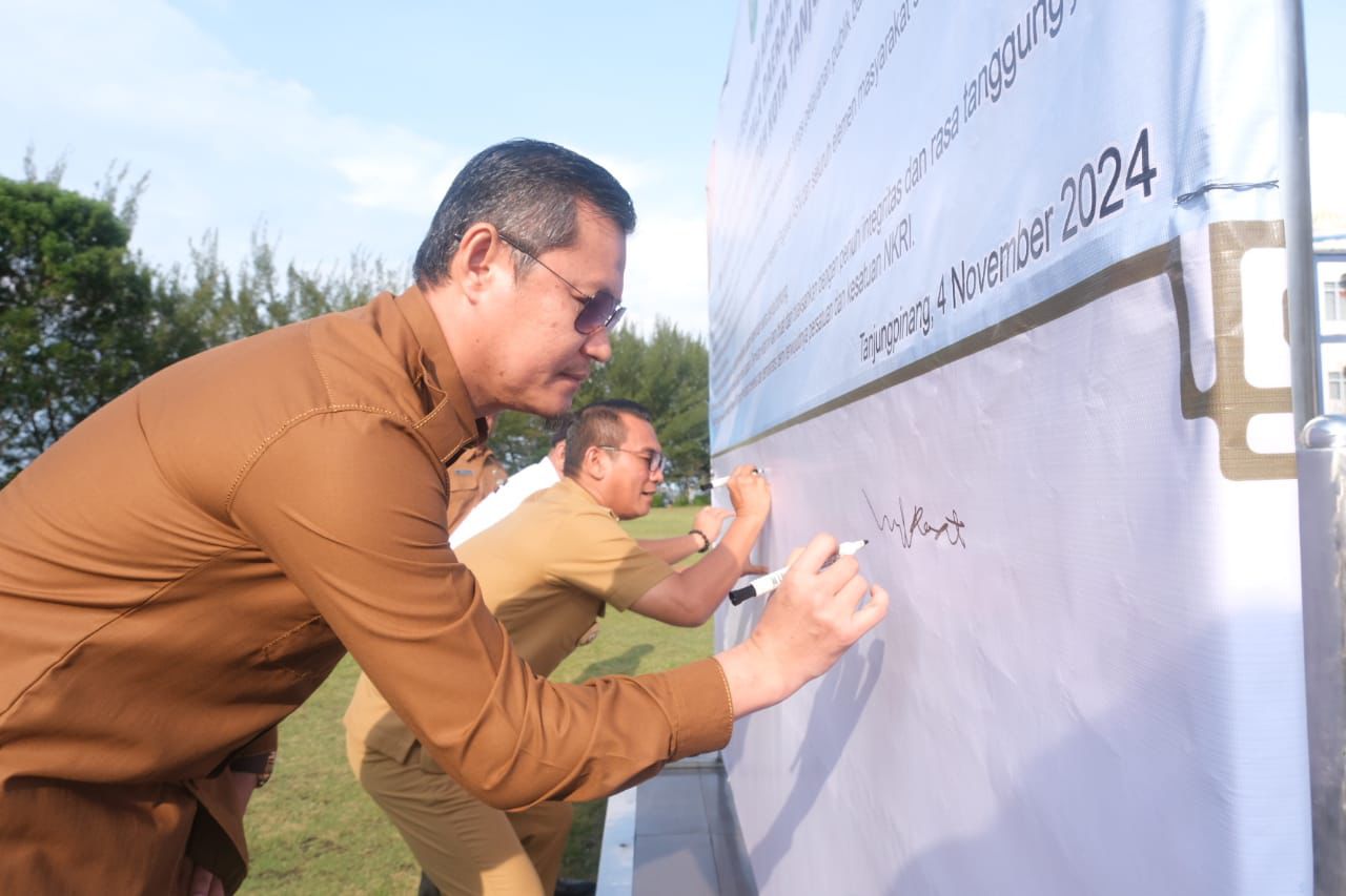 Tanjungpinang — Pemerintah Kota (Pemko) Tanjungpinang melaksanakan upacara dalam rangka penandatanganan pakta integritas netralitas ASN yang dipimpin langsung Penjabat (Pj.) Wali Kota Tanjungpinang, Andri Rizal, di halaman kantor Wali Kota, yang diikuti seluruh pegawai Pemko Tanjungpinang, Senin (4/11/2024).