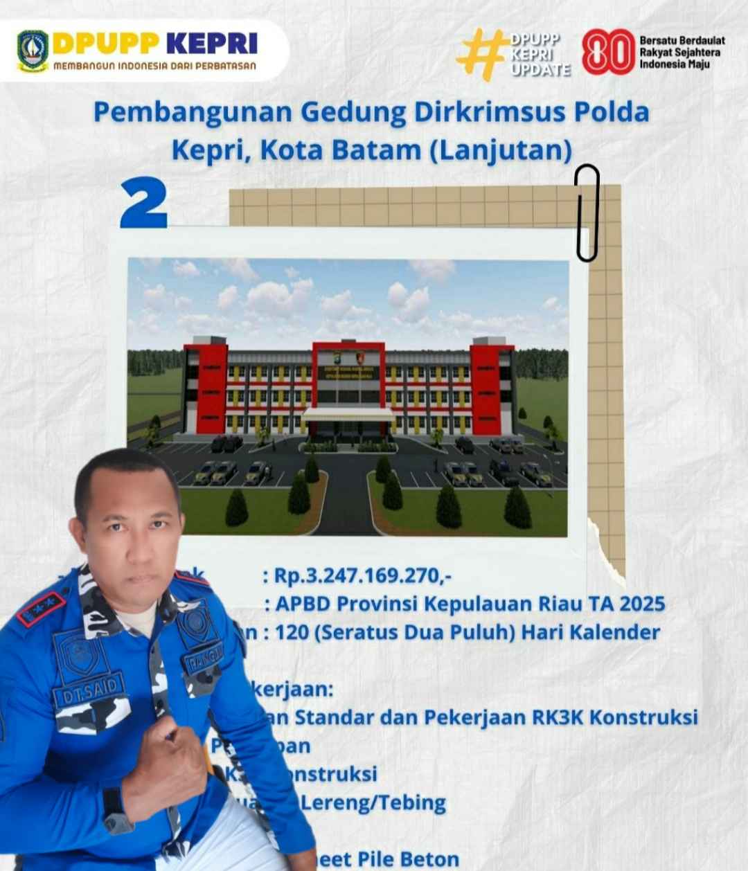 Ketua Gerakan Anak Melayu Negeri Riau (GAMNR) Kota Tanjungpinang, Said Ahmad Syukri, berpose di samping infografis pembangunan lanjutan Gedung Ditkrimsus Polda Kepri di Kota Batam yang dibiayai dari APBD Kepri TA 2025, Jum'at (29/8).