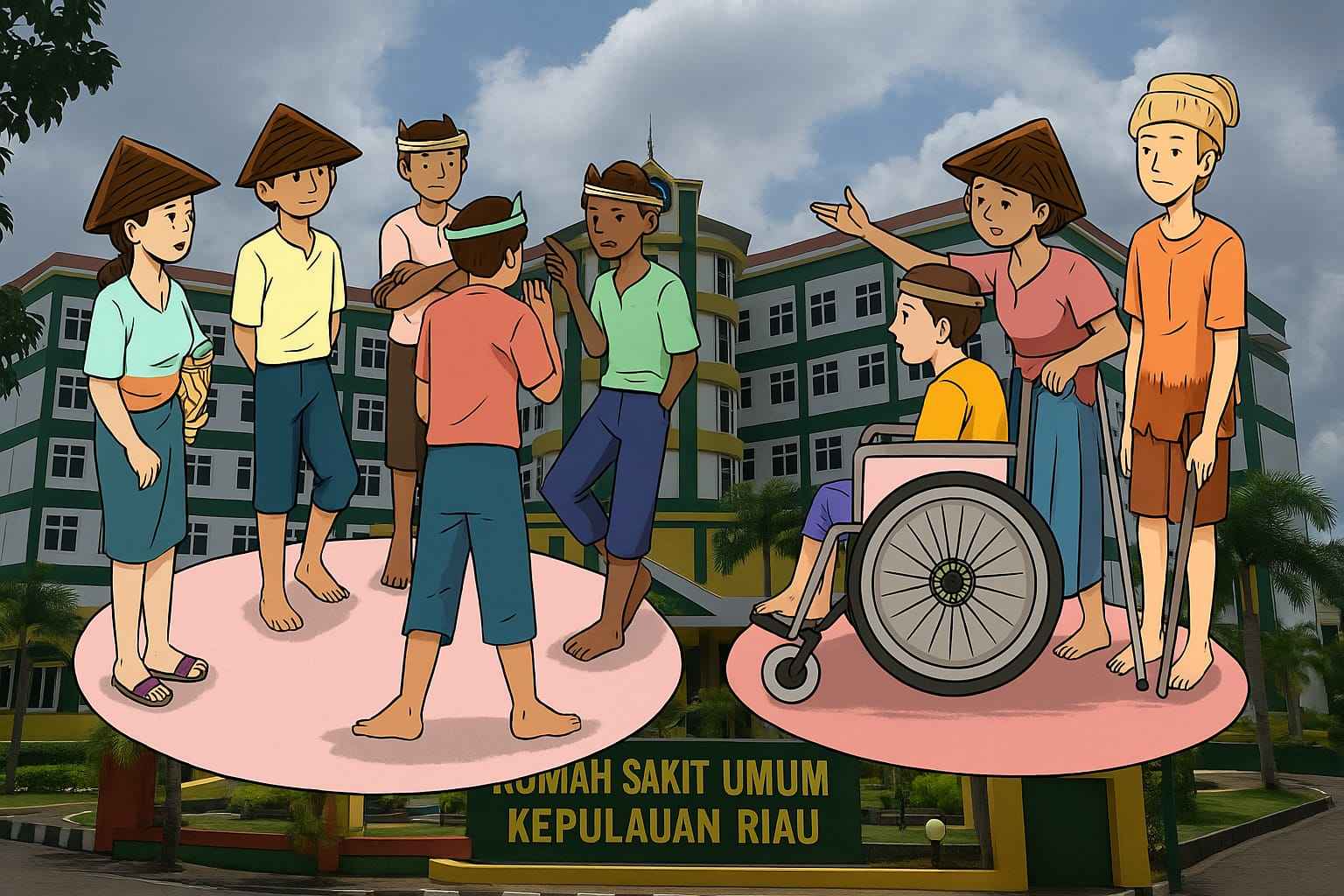 Ilustrasi perpaduan gedung RSUP Raja Ahmad Tabib Kepulauan Riau dengan simbolisasi keresahan pegawai dan masyarakat terhadap ketidakadilan pembagian jasa pelayanan, Kamis(25/9).