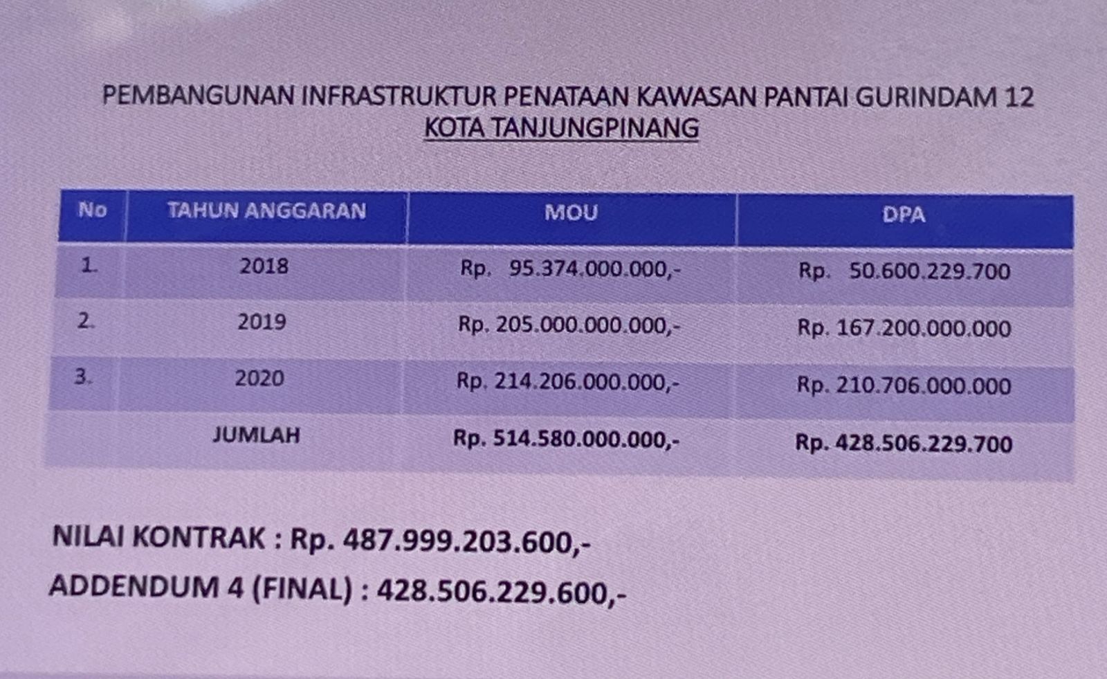Menurut Rodi, pembangunan kawasan Gurindam 12 dilaksanakan melalui program multiyears 2018 – 2020 dengan pagu anggaran Rp514 miliar dan nilai kontrak sebesar Rp488 miliar yang bersumber dari APBD Provinsi Kepulauan Riau. Seiring pelaksanaan, dilakukan addendum kontrak sehingga nilainya berkurang menjadi Rp428,5 miliar.