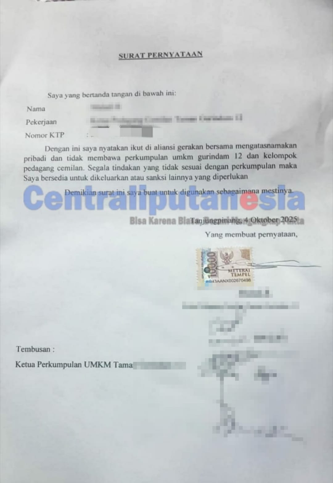 Tanjungpinang – Gerakan Bersama (GEBER) Kepri menerima laporan dan salinan surat yang diduga bernuansa intimidasi terhadap salah satu pedagang di kawasan Taman Gurindam 12, Minggu (5/10/2025). Surat tersebut berkaitan dengan dugaan tekanan yang dilakukan oleh kelompok yang mengaku sebagai organisasi pedagang UMKM, namun belum memiliki legalitas hukum.